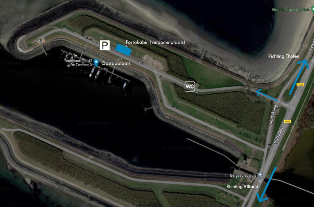 In het navigatiesysteem kunt u het beste Rondvaartbedrijf De Zwerver 3, dat in de haven gevestigd is, als bestemming opgeven. Als u de route vanuit Tholen volgt, dan ligt de haven vóór de sluis aan de rechter kant. U kunt met de auto helemaal tot aan de opstapplaats komen. Daar is voldoende gratis parkeergelegenheid. De haven is niet bereikbaar met het openbaar vervoer, wél met de fiets.